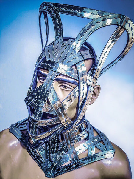 This cage mask headpiece is made by divamp couture, a futuristic helmet or mask for scifi purposes steampunk, fetish cyber headdress cybergoth cosplay industrial